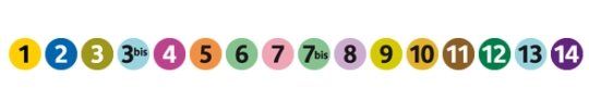 La red de metro de París está compuesta por 14 líneas enumeradas del 1 al 14 y dos líneas menores más, 3bis y 7 bis.
